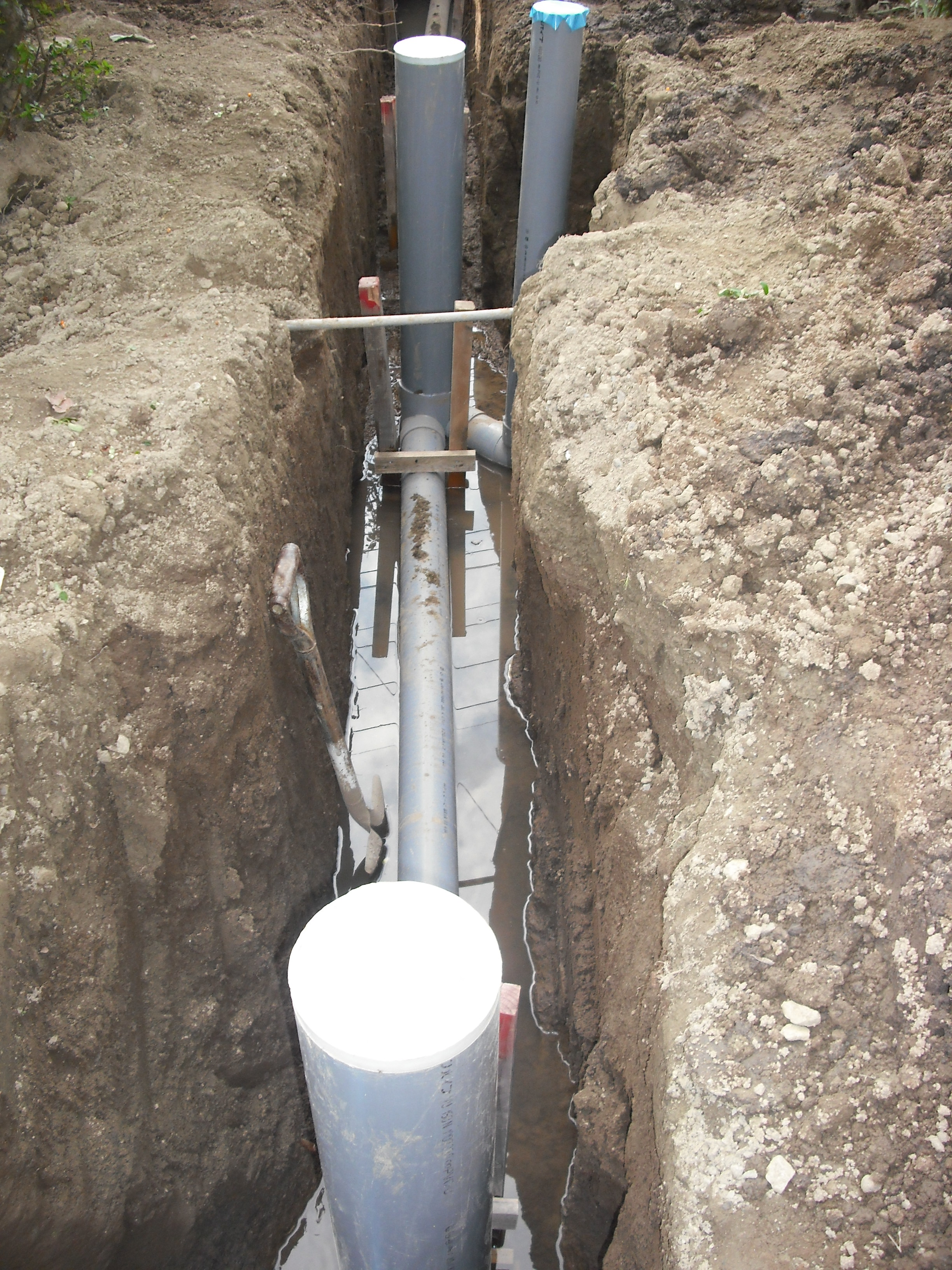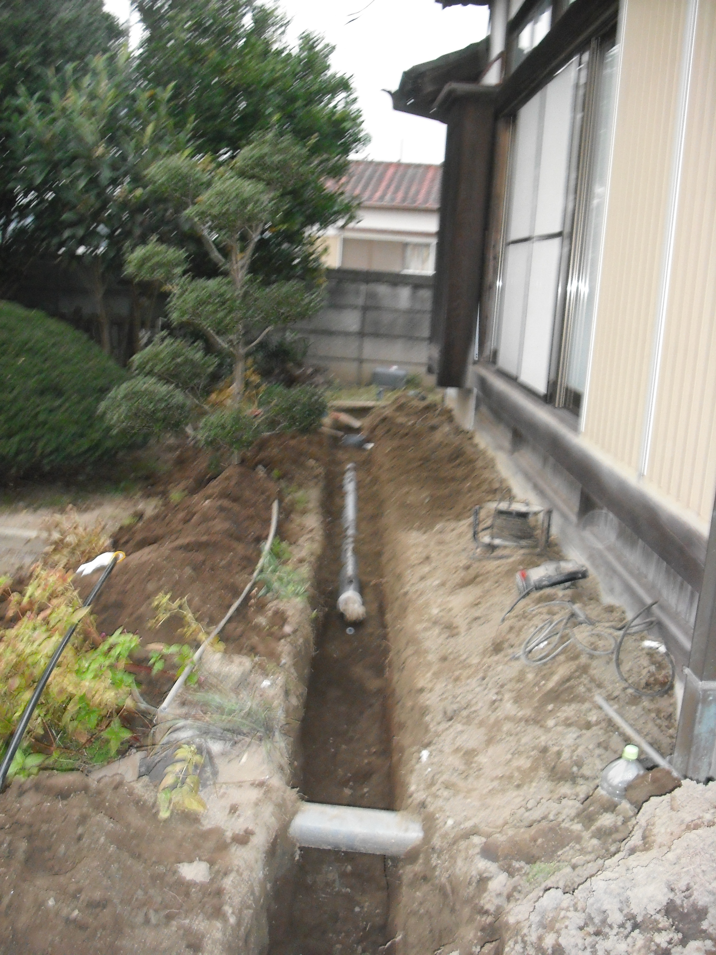 つくば市小田地内UT邸公共下水道接続工事、排水配管布設中